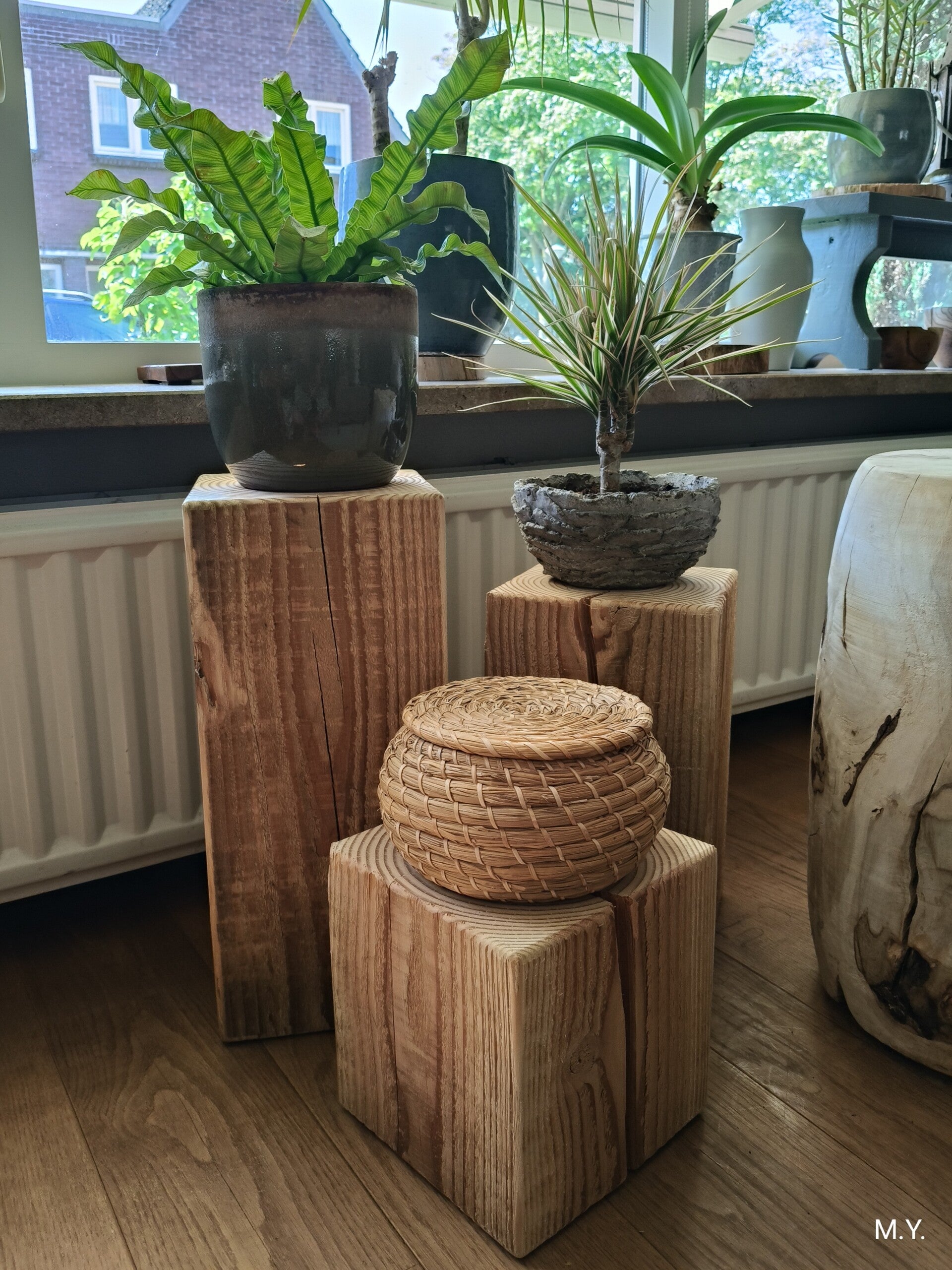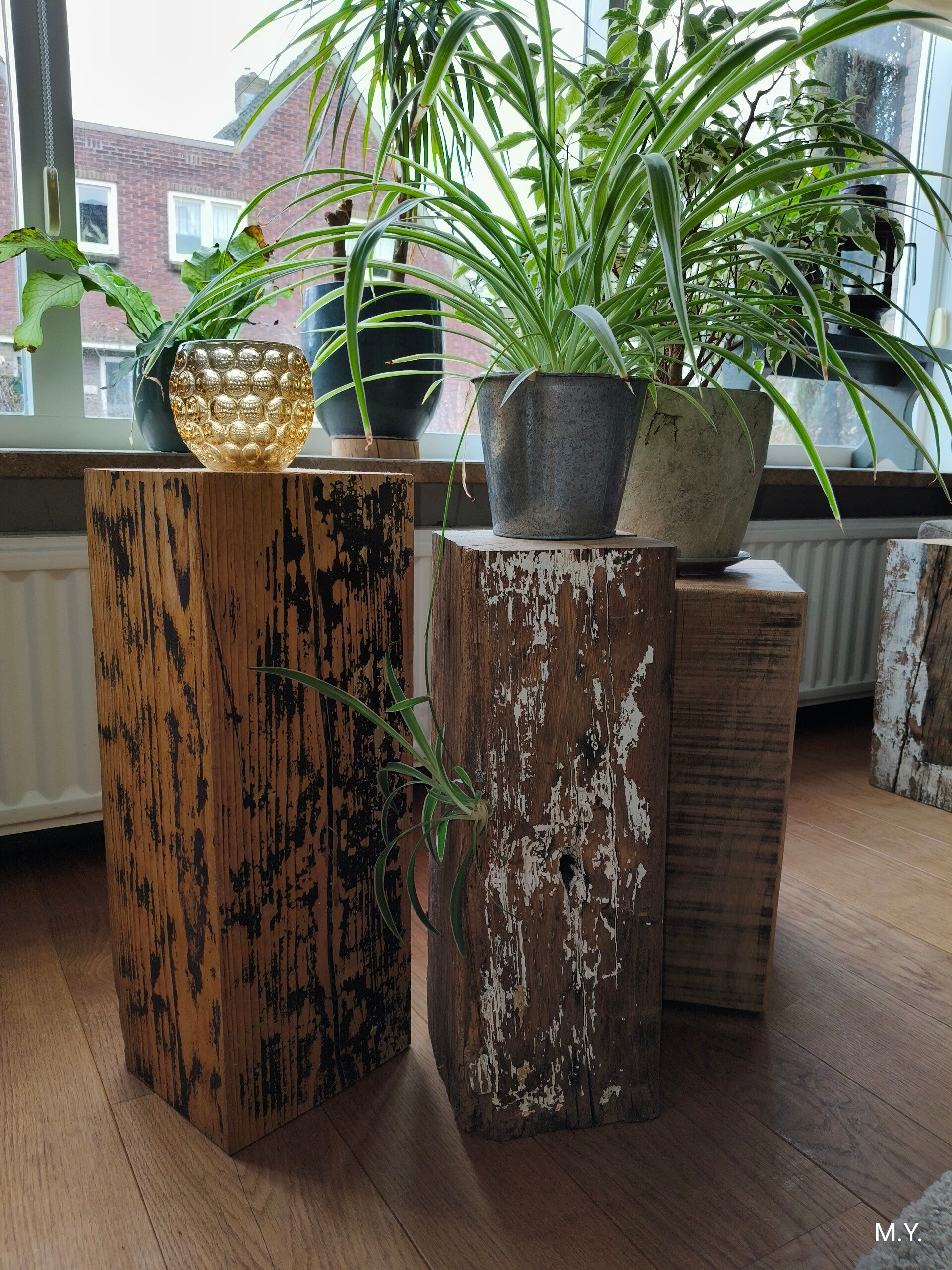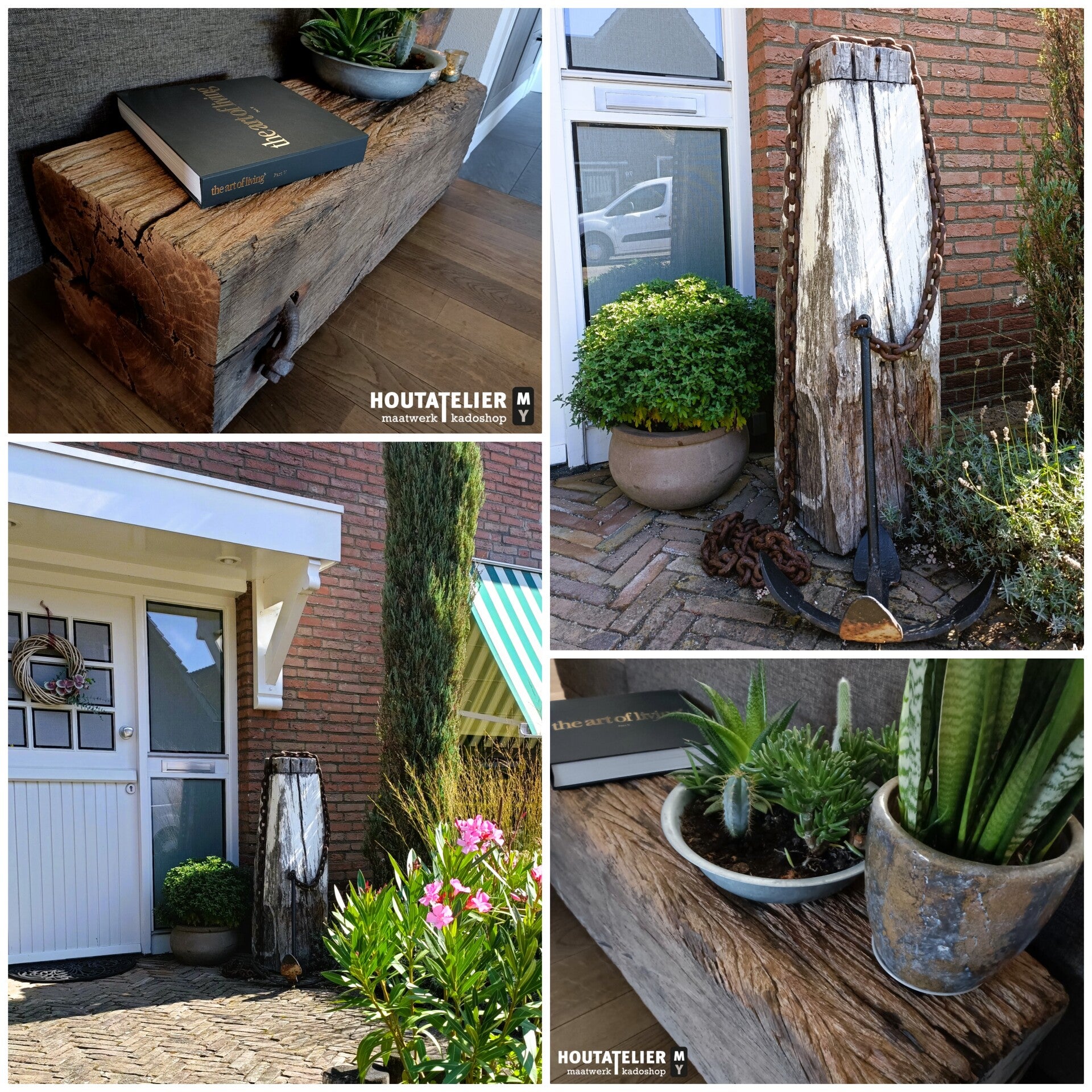 Er zijn verschillende houtsoorten mogelijk. Afhankelijk van jouw wensen — bijvoorbeeld robuust of juist strak — selecteren we uit onze voorraad de stammen die het meest geschikt zijn voor het maken van de gewenste zuil. Zoals te zien is op de voorbeeldfoto’s, zijn er talloze variaties in vorm en uitstraling mogelijk.