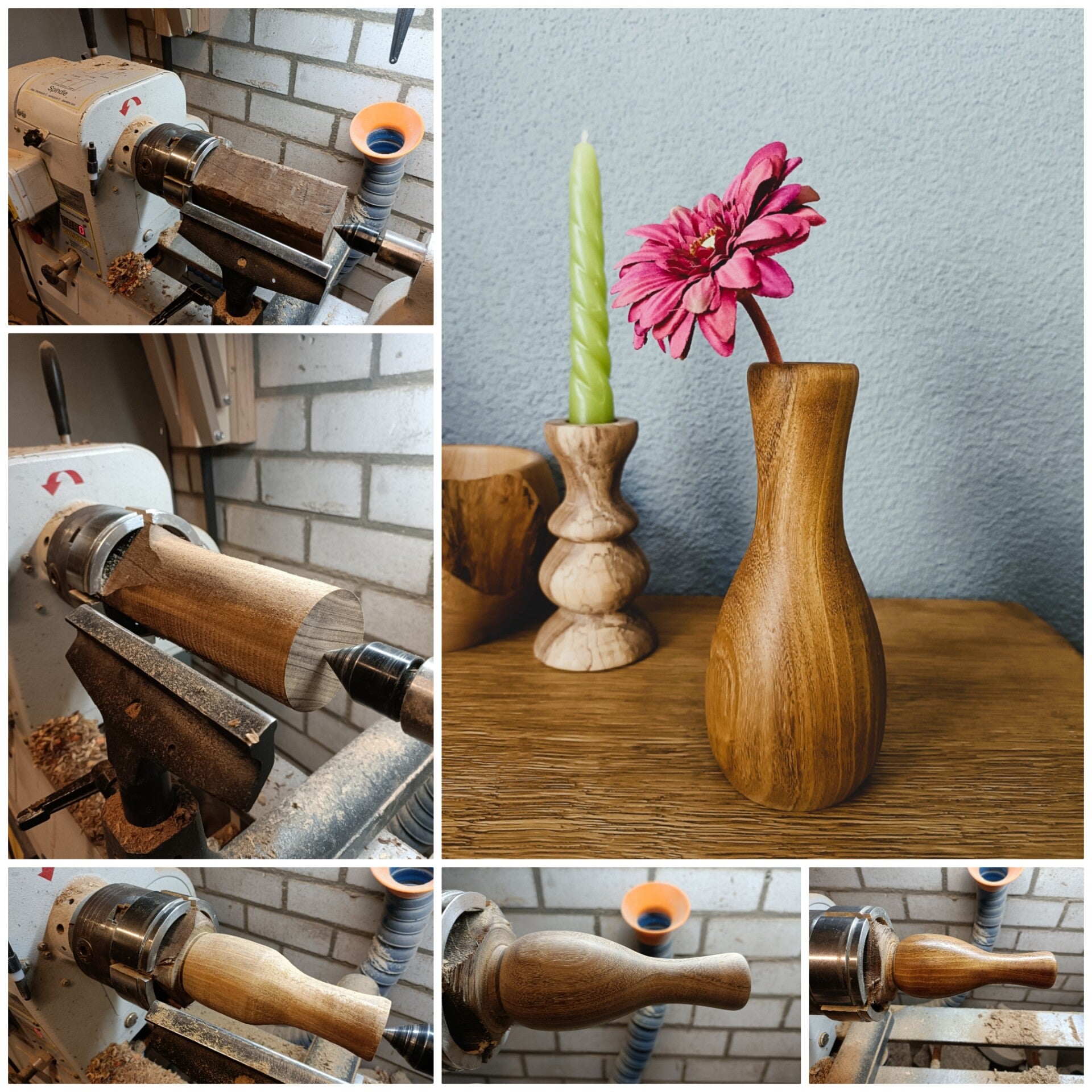 Mark werkt op de houtdraaibank graag aan grotere stukken, zoals schalen, vazen en zuilen. Yvonne richt zich juist op het fijnere werk, met ornamenten, kandelaars en kleine vaasjes. Ook het maken van sieraden staat nog op de planning 😊